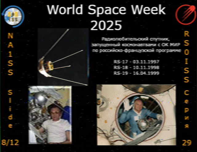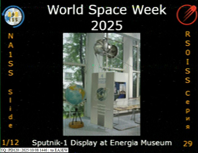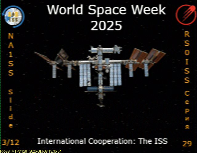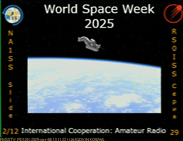| Submitted by: Franci Padeznik, S51HF, Europe Acquired: 2025-10-08 13:13:00 Mission: Expedition 73 - ARISS Series 29 World Space Week 2025 |  | Submitted by: Hans-Joachim Immig, DL9NEE, Europe Acquired: 2025-10-07 10:47:00 Mission: Expedition 73 - ARISS Series 29 World Space Week 2025 |  | Submitted by: IGOR, KULIKOV, Select a region Acquired: 2025-10-08 13:11:00 Mission: Expedition 73 - ARISS Series 29 World Space Week 2025 |