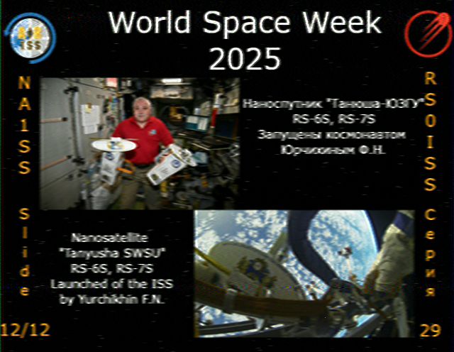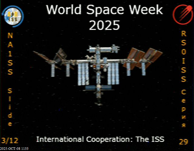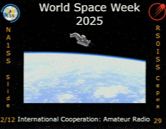 | Submitted by: Franci Padeznik, S51HF, Europe Acquired: 2025-10-08 13:13:00 Mission: Expedition 73 - ARISS Series 29 World Space Week 2025 |  | Submitted by: Hans-Joachim Immig, DL9NEE, Europe Acquired: 2025-10-07 10:47:00 Mission: Expedition 73 - ARISS Series 29 World Space Week 2025 |  | Submitted by: IGOR, KULIKOV, Select a region Acquired: 2025-10-08 13:11:00 Mission: Expedition 73 - ARISS Series 29 World Space Week 2025 |