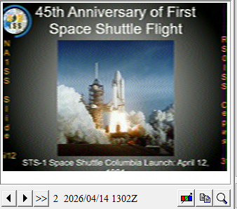 | Submitted by: Tomas, OK1VCF, Europe Acquired: 2026-04-13 09:02:00 Mission: Expedition 74 - ARISS Series 31 World Space Commemoration |  | Submitted by: Pascal, f5poe, Europe Acquired: 2026-04-11 10:34:00 Mission: Expedition 74 - ARISS Series 31 World Space Commemoration |  | Submitted by: Kirt Krause N9WVD, N9WVD, NorthAmerica Acquired: 2026-04-13 19:52:00 Mission: Expedition 74 - ARISS Series 31 World Space Commemoration |