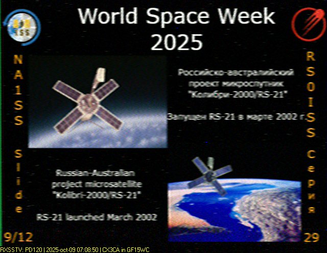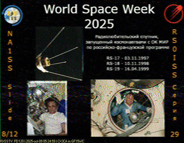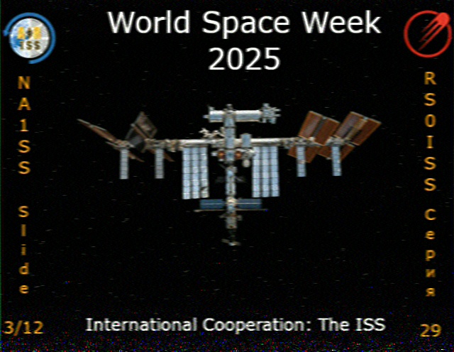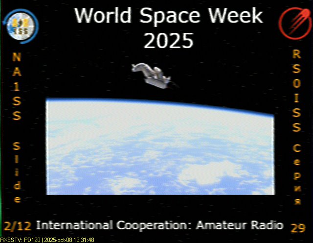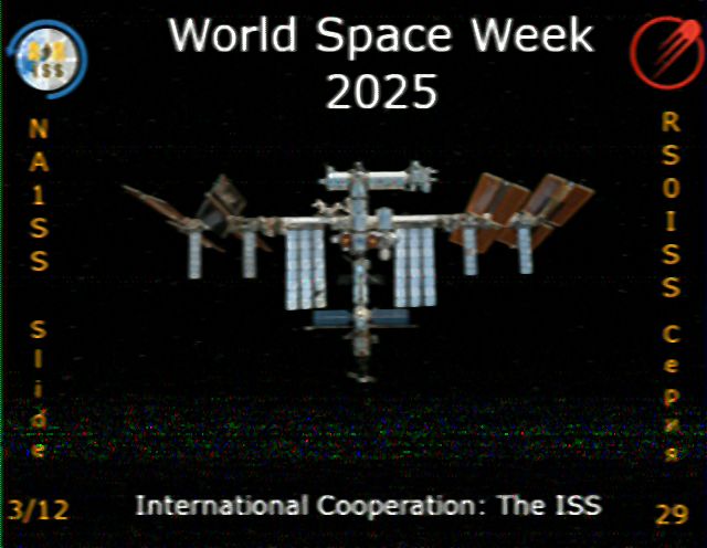 | Submitted by: Luigi Camisa, IW4EIL, Europe Acquired: 2025-10-07 14:07:00 Mission: Expedition 73 - ARISS Series 29 World Space Week 2025 |  | Submitted by: Luigi Camisa, IW4EIL, Europe Acquired: 2025-10-07 14:07:00 Mission: Expedition 73 - ARISS Series 29 World Space Week 2025 |  | Submitted by: John Fickes, W0JW, NorthAmerica Acquired: 2025-10-08 20:51:00 Mission: Expedition 73 - ARISS Series 29 World Space Week 2025 |