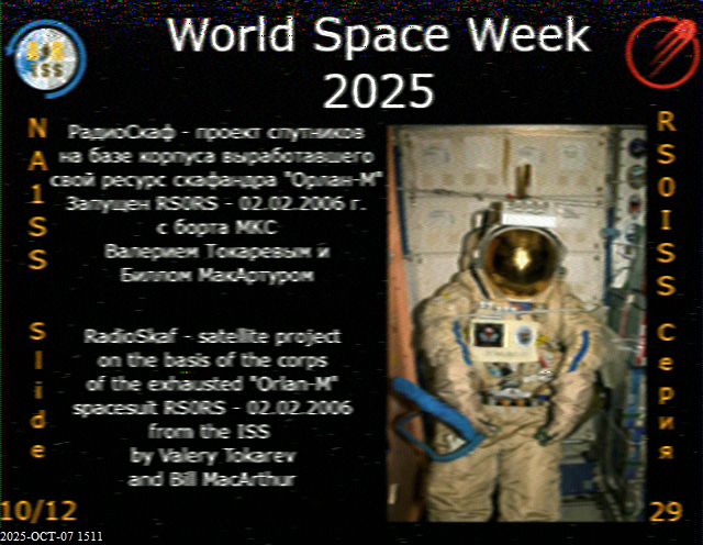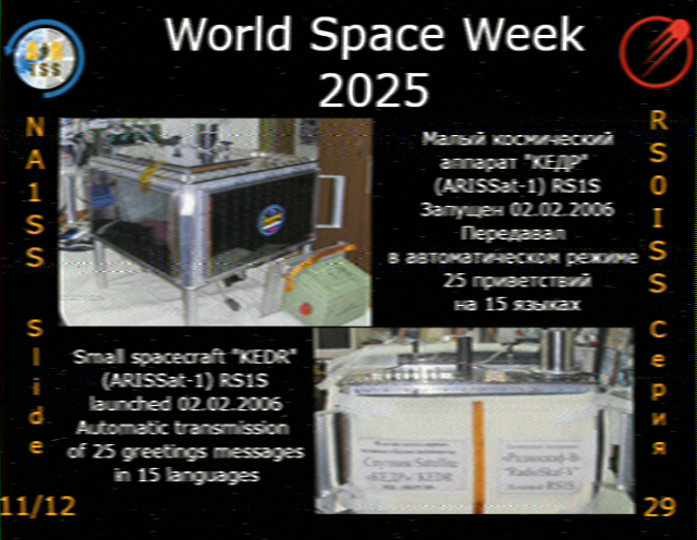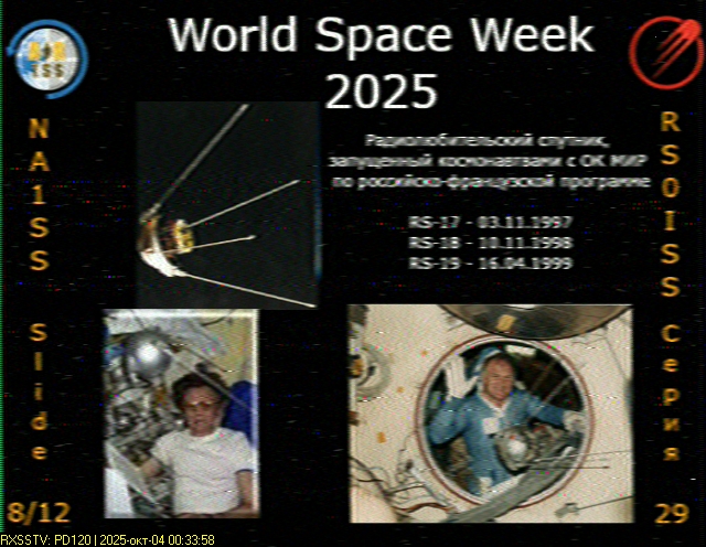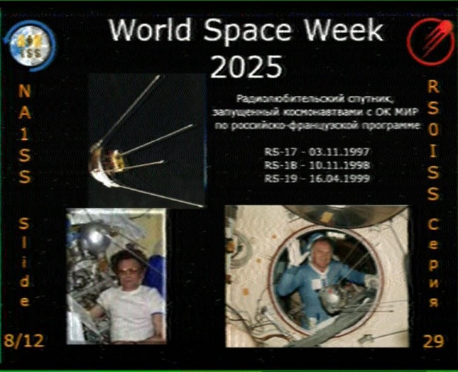 | Submitted by: Thomas Breyer, DJ6TB, Europe Acquired: 2025-10-09 07:35:00 Mission: Expedition 73 - ARISS Series 29 World Space Week 2025 |  | Submitted by: Thomas Breyer, DJ6TB, Europe Acquired: 2025-10-04 11:33:00 Mission: Expedition 73 - ARISS Series 29 World Space Week 2025 |  | Submitted by: SERGEJ GONCHARENKO , RA0LX, Asia Acquired: 2025-10-04 00:33:00 Mission: Expedition 73 - ARISS Series 29 World Space Week 2025 |